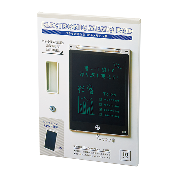 書いて消して、繰り返し使える便利な電子メモパッド。 裏面マグネット付で冷蔵庫などに貼れて便利。ペーパーレスになり、環境にもやさしい。