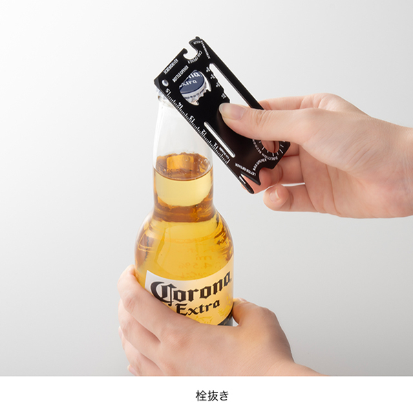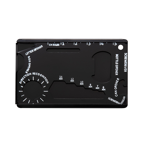 ずっしりしたアルミ製なのに薄くて便利!オープナーやドライバー、ルーラーなど14個の機能が付いた有能すぎるマルチカードツールです。 薄型カードサイズなので、財布やポケットなどにも収納可能。キーホルダーとしてバッグなどに付けられるキーチェーンも付属しています。定番品とはひと味違ったご挨拶ノベルティとして人気の高い商品です。