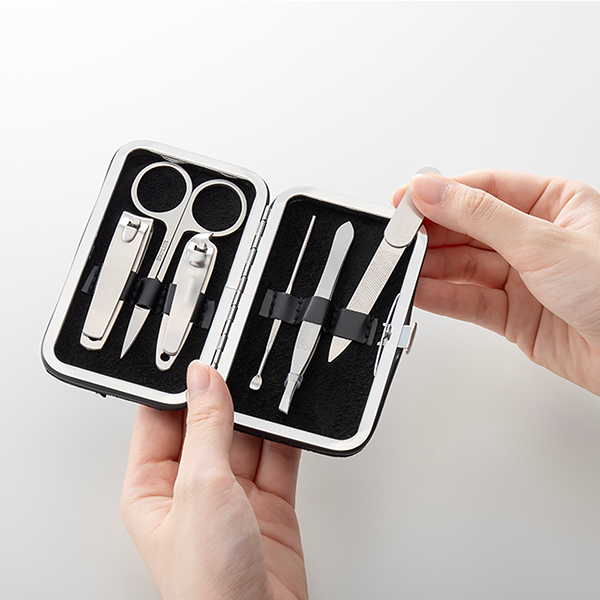 身だしなみは手先から!ステンレス製のネイルケア用品がセットになったネイルケアセットです。 爪切り(大小)・毛抜き・耳かき・ハサミ・爪やすりがセットされています。意外と見られている爪や指、手。綺麗にしておくとプライベートではもちろん、商談時にも自信が付くかも?ブラックのケースは品がありながらも華美過ぎず、男女兼用でお使いいただけます。