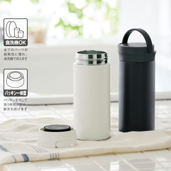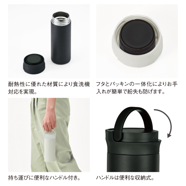 フタとパッキンが一体化しているためお手入れ簡単!食洗器対応のステンレスボトルです。 ハンドル付きで持ち運びやすい仕様です。ハンドル部分はパタンと倒せるため、使わない時もコンパクトに収納できます。