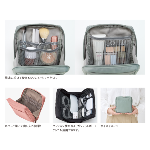 落ち着いたカラーが大人かわいいポーチです。間口が大きく開き、ポケットがたくさんついているのがポイント。 クッション性もあるため、スマホ・PCの周辺機器の収納にもおすすめです。