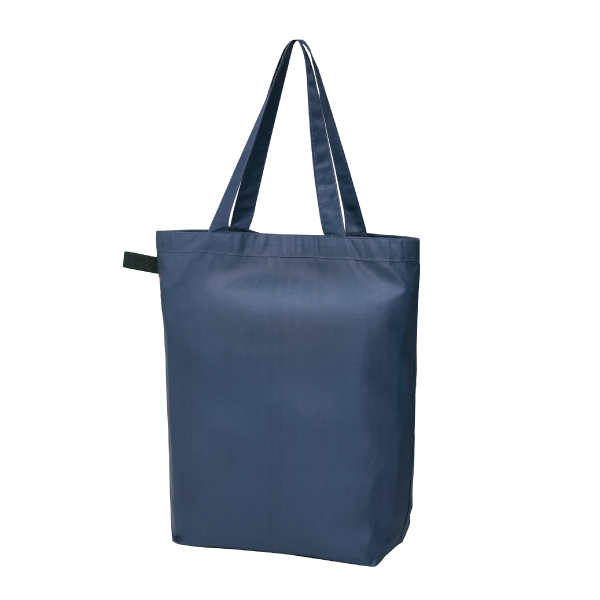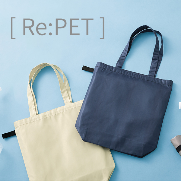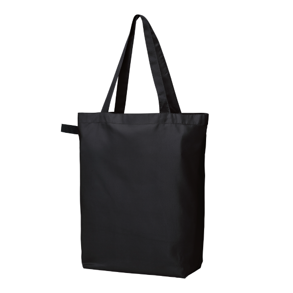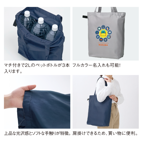 再生ポリエステルを使用したエコバッグです。上品な光沢感とソフト手触りが魅力です。 2Lのペットボトルが3本も入る大容量。肩掛けできるため楽に持ち運びできます。