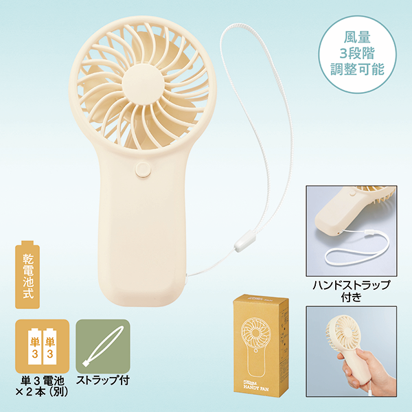暑さ対策アイテムの定番!どこに行くにも持ち歩きたいハンディファンです。 軽量コンパクトなデザインなので、付属のハンドストラップを付けて携帯すれば手軽に涼むことができます。ハンディファンは販促品でも大人気ですから、ノベルティとして選ぶ際は名入れが目立つデザイン、使い勝手の良さを押さえたものがおすすめです。