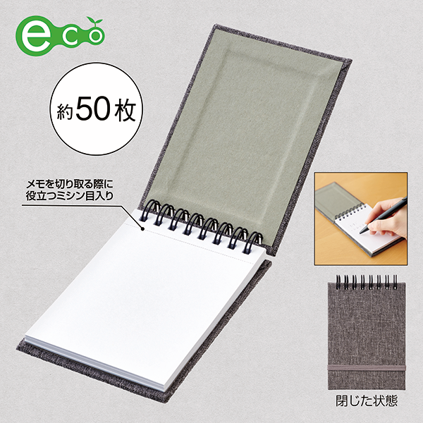 表紙にリサイクルPET生地を使用し本文のメモ用紙は再生紙と、環境に配慮したエコメモ帳。 ビジネスでもプライベートでも使用頻度の多いデスク回りに置いておきたいアイテムは、年齢や性別問わず喜ばれる実用性が魅力。セミナーや企業説明会などのノベルティにおすすめです。