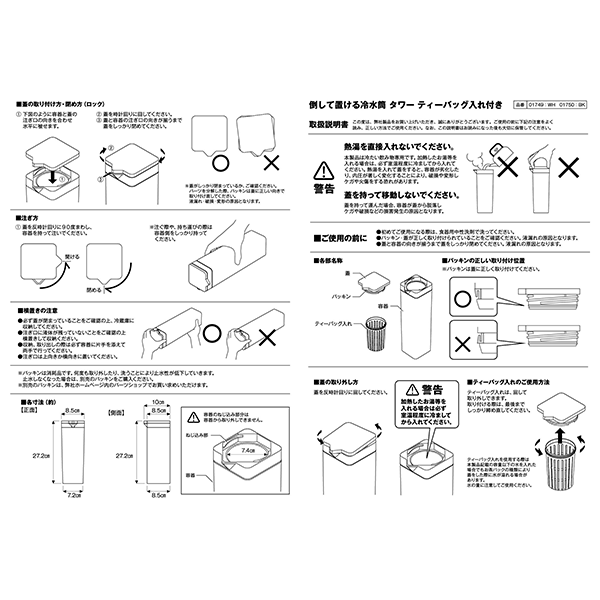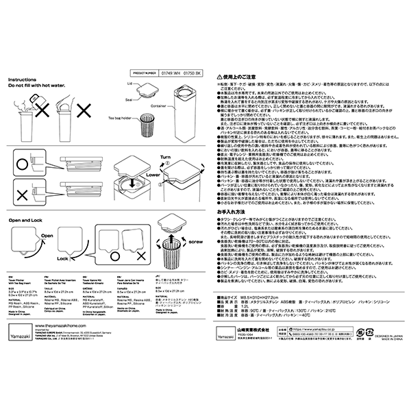 | 素材 | 容器:メタクリルスチレン ABS樹脂 蓋・ティーバッグ入れ:ポリプロピレン パッキン:シリコーン |