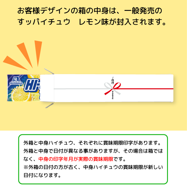 幅広い世代に親しまれるハイチュウから、爽やかな酸味が特長の「すッパイチュウ〈レモン味〉」のオリジナルデザイン5本セットとして展開できます。