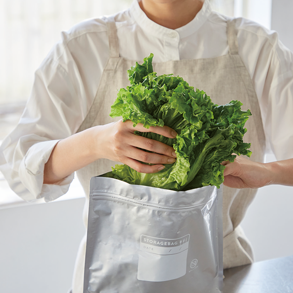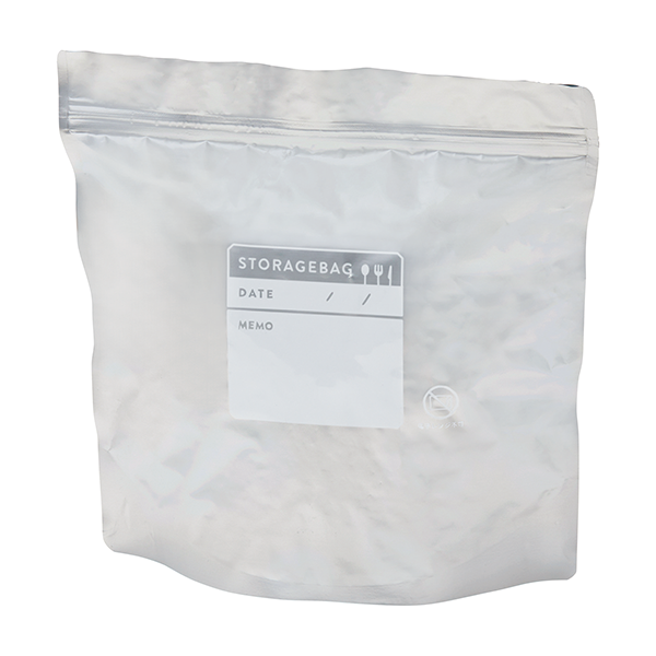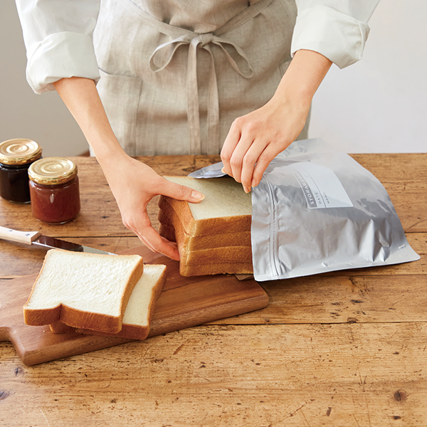 乾燥や臭いから食材を守るアルミジッパー保存袋。PET・アルミ・PEの3層構造でおいしさをキープ。 マチ有りで、5枚切りの食パンが4枚入る収納力。
