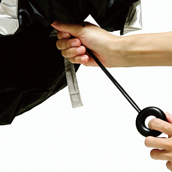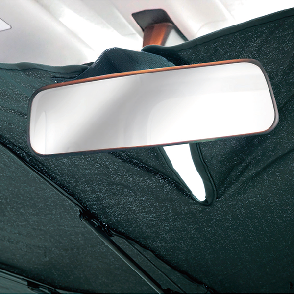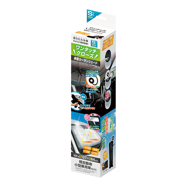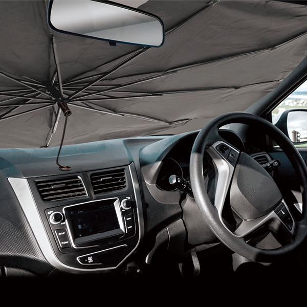 折りたたみ傘のように簡単展開できる車用のサンシェード。手間いらずでワンタッチクローズ。 シルバーコーティングで熱やUVをカット。