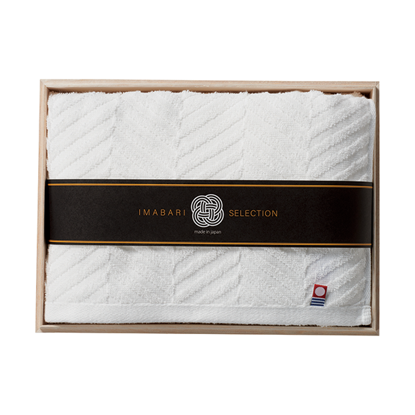 タオルの聖地である今治産のバスタオル。上品なあぜ織りが印象的です。 高級感のある木箱入りでギフトに最適です。