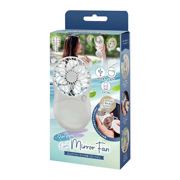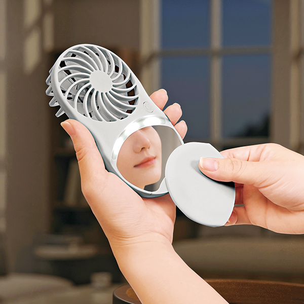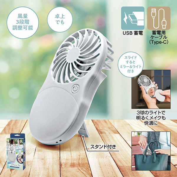 ファンで涼む・ミラーでチェックがこれ1台で出来る! ミラーとライトが付いた女性に嬉しいスマートファンです。 暑さ対策アイテムは春夏の販促品の中でも特に人気のジャンル!アウトドアだけでなく、社会人やファミリー向けなど幅広いイベントのノベルティにお使いいただけます。