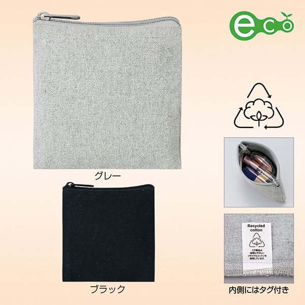 口紅やイヤホン、サプリメントなど細かな小物の収納にぴったりの、正方形型ポーチ。 リサイクルコットンを使用しており、SDGsへの意識もアピールできるエコロジカルな一品です。もちろん名入れもOK。ポーチはシーズン問わず人気のノベルティのため、おしゃれで使い勝手の良いものを選ぶことでプロモーション効果もアップします。