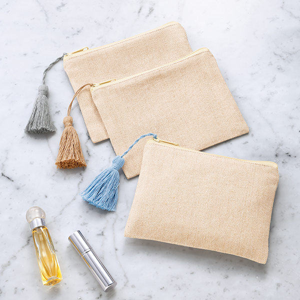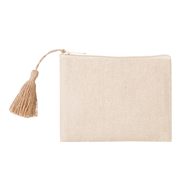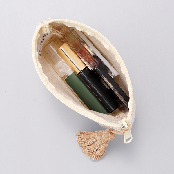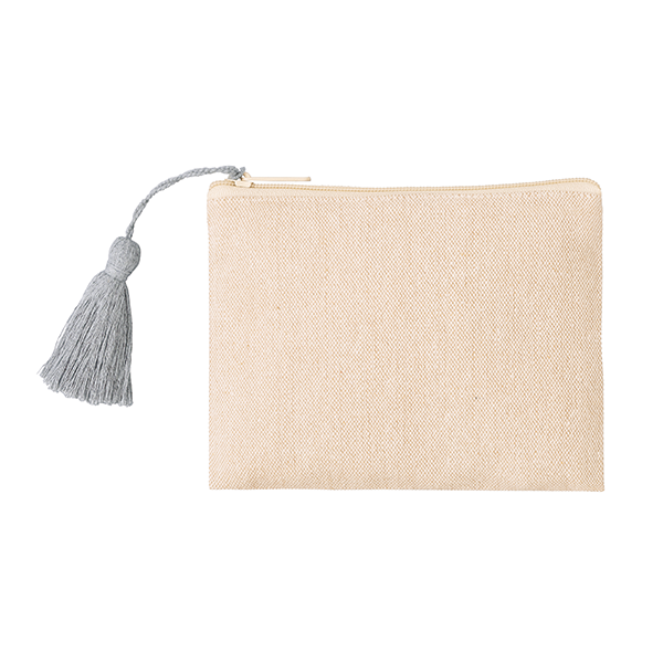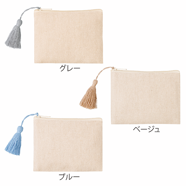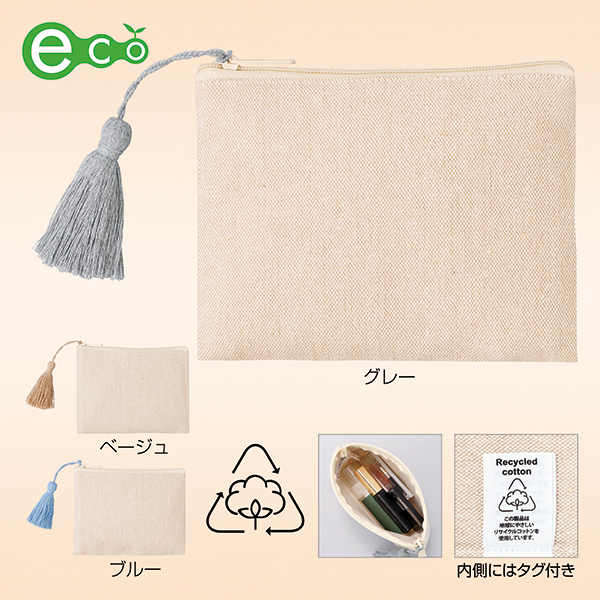 エコアイテムらしいナチュラルな質感とカラーがお洒落なリサイクルコットンのポーチです。 アクセサリーのように揺れる大きめタッセルがアクセント。もちろん名入れもOK。ポーチはシーズン問わず人気のノベルティのため、おしゃれで使い勝手の良いものを選ぶことでプロモーション効果もアップします。