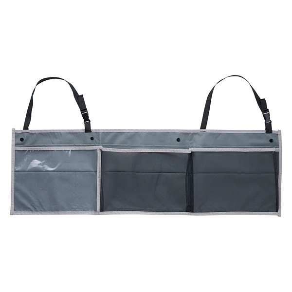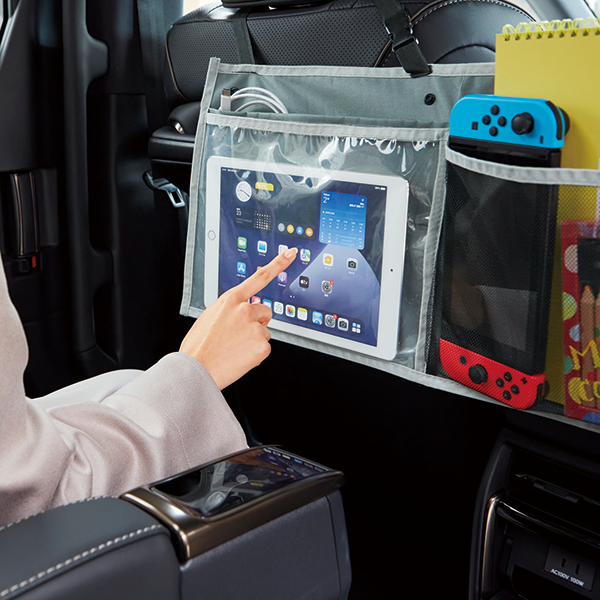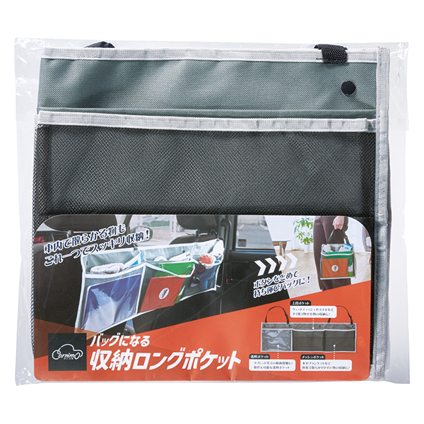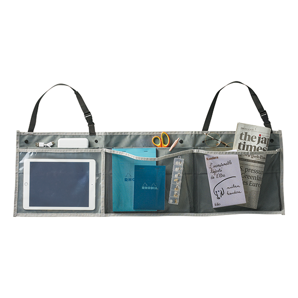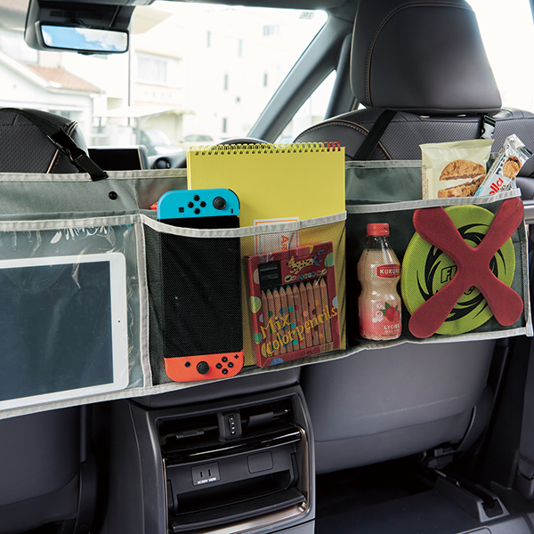 車のヘッドレストに掛けて使用する収納ポケット。 6つの収納ポケットで、車内に散らばりやすい小物類を快適に整理します。移動時は畳んでバッグにして持ち運びも可能です。