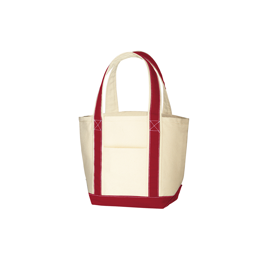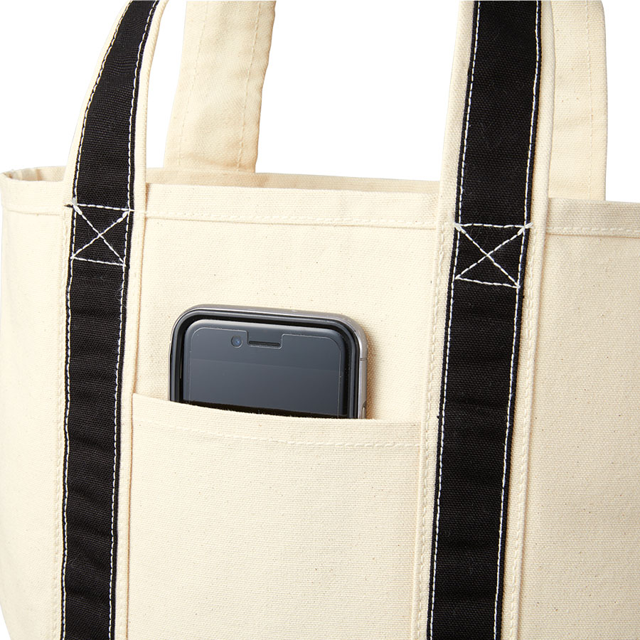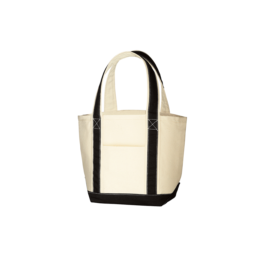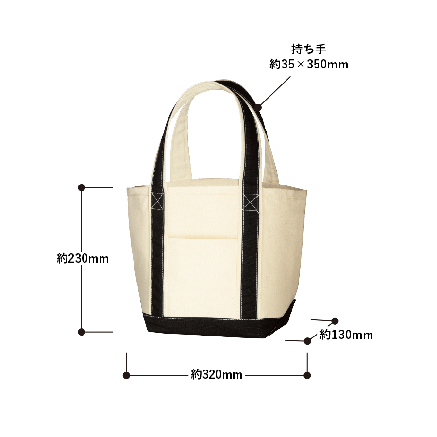 ちょっとした外出に便利なサイズのバイカラー配色が冴えるトートバッグです。広めの底マチが使いやすく、生地も厚手なのでバッグ単体で自立もします。同仕様でMサイズ、Lサイズもございますので、お好みのサイズからお選びください。