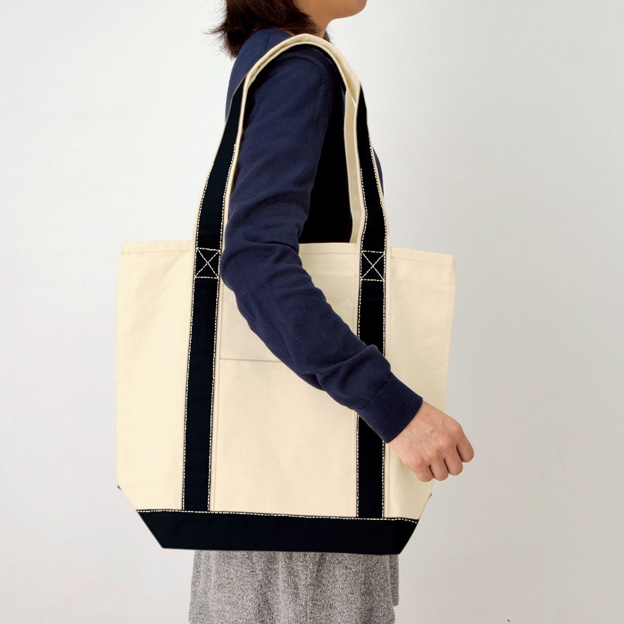 A4サイズも余裕を持って収容可能な普段使い適したコットントートバッグです。広めの底マチが使いやすく、生地も厚手なのでバッグ単体で自立もします。同仕様でSサイズ、Lサイズもございますので、お好みのサイズからお選びください。