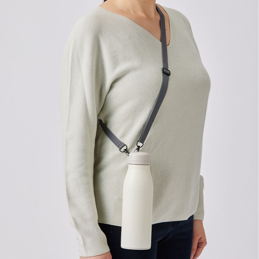 斜め掛け可能なショルダー付きボトル。保冷保温ができるサーモステンレスボトルを使用しているのでお出かけに最適。
