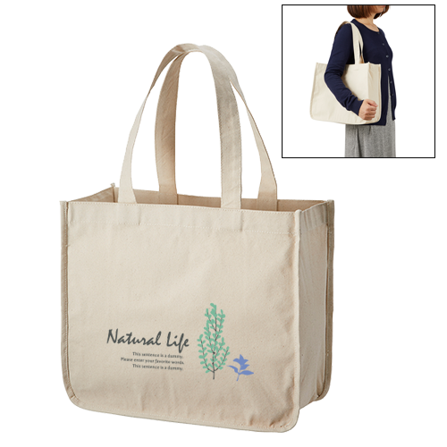 四角いフォルムが可愛い、スクエアタイプです。中の荷物が崩れにくく見た目以上に収納力があり、使い勝手がいいトーバッグです。12ozで厚めの生地なのでノベルティだけでなく販売品としてもおすすめの商品です。ひとまわり大きいLサイズもございます。本体色ナチュラルは自然な風合いが人気です。無漂白エコマーク認定商品でもあるため、サスティナブルなオリジナルグッズをお探しの方やナチュラルな風合いが喜ばれるアパレル業界のノベルティにおすすめです。高密度で織り上げることで丈夫かつ美しい生地面を実現。イラストやロゴなどの名入れも綺麗に印刷できます。フォルムが個性的で可愛らしいため、シンプルな1色印刷であってもセンスのいいノベルティに仕上がります。