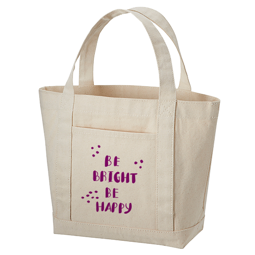 ハンドルラインに特徴のある、コンパクトなトートバッグです。外側ポケットには携帯や定期など、さっと取り出して使いたいものが入れられます。本体色を単色で仕上げているため名入れ映えします。ワンポイントの印刷でもおしゃれな仕上がりに。カジュアルなコーディネートにもぴったりはまります。底マチがしっかりついているのでお弁当や財布などを入れやすく、通勤・通学のサブバックにも活躍しそうです。ノベルティはもちろん販売品としても人気があります。生地目が細かく丈夫なつくりなので卒園記念品や契約特典などプレミアムなギフトにも向いています。