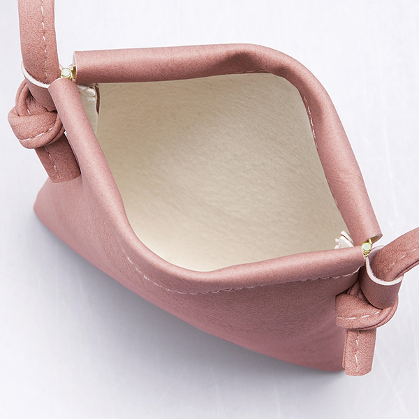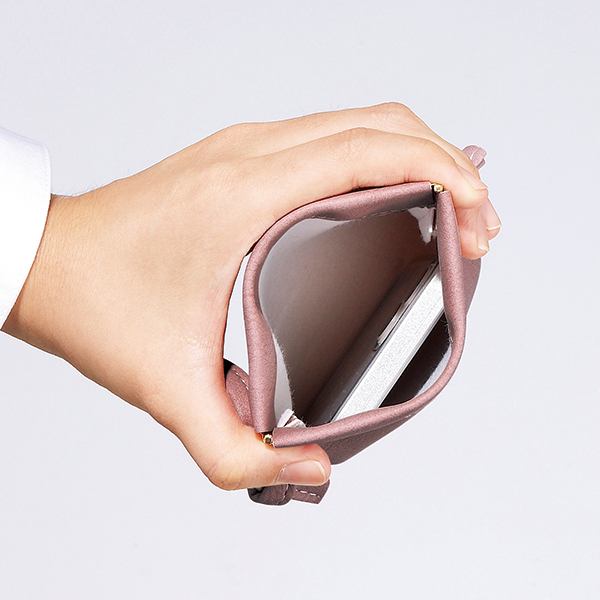 レザー調生地がコーデに上品さを演出する、片手で開封できる手軽さが特徴のばね金具仕様のネックポーチです。
