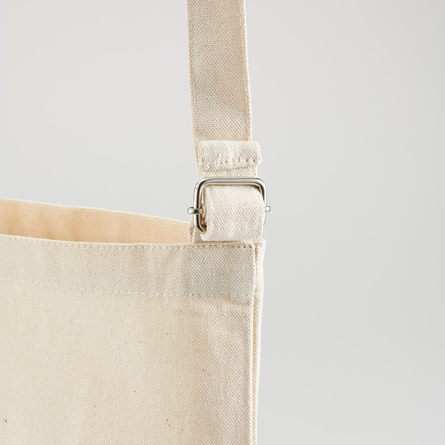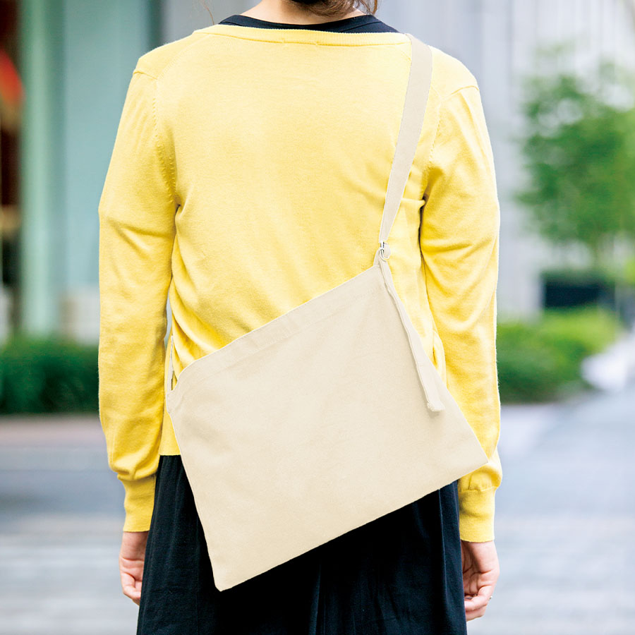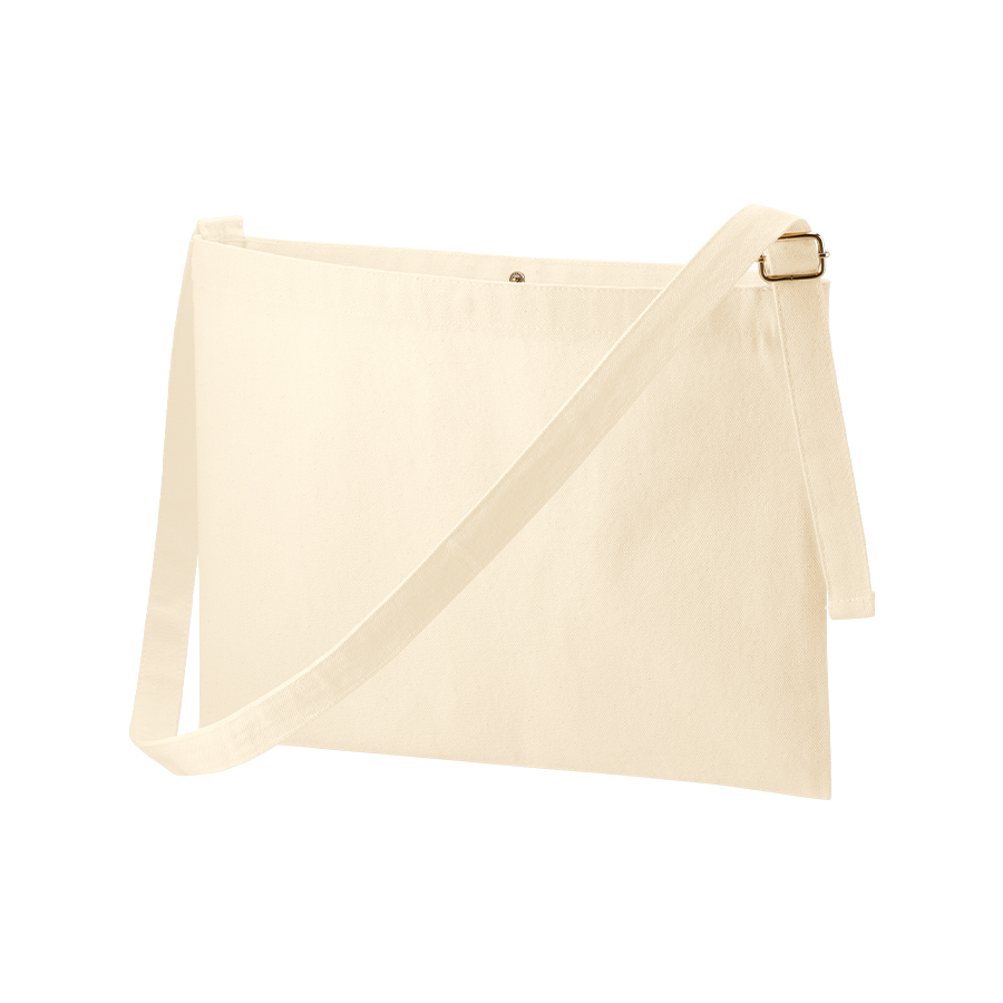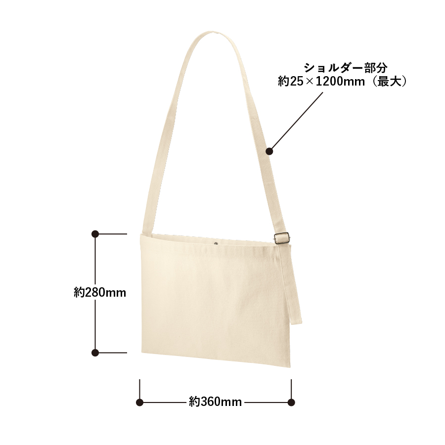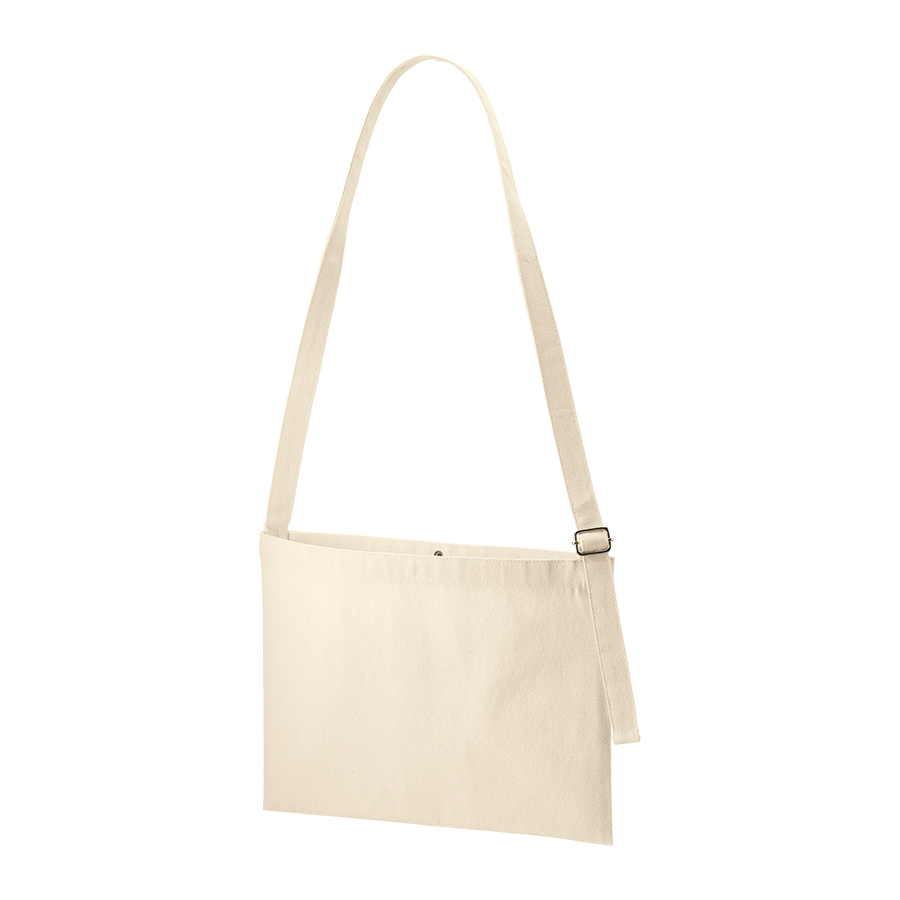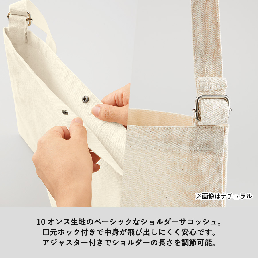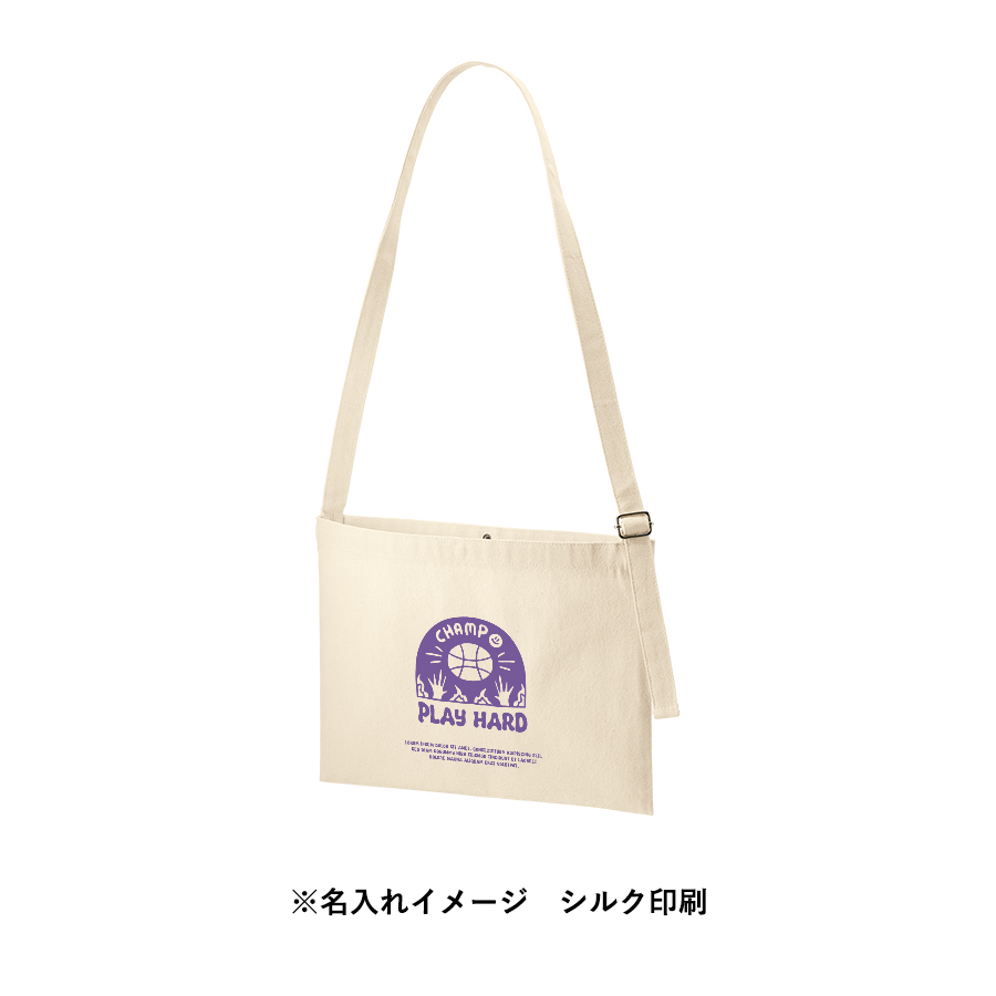 キャンバスアジャストショルダーサコッシュ、ナチュラルは、長さ調節が可能なアジャスター付きのサコッシュです。ショルダーを短くして持ち歩く流行りのスタイルも可能でおしゃれさを演出します。またお子様でも使用出来るのでレッスンなどの習い事にも活用出来ます。生地は10オンスを採用しており、中身が透けにくく便利です。口元にはホックがついているので走ったり自転車に乗っても中身が飛び出ず安心です。印刷面が広く、両面にも印刷が可能。熱転写やインクジェット印刷が可能で、フルカラー印刷が映えます。展示会やオープンキャンパス、スポーツイベントなどノベルティだけでなく物販としてもご利用頂けるマルチな商品です。リーズナブルな価格も嬉しいポイントですね。