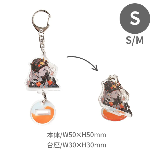 スタンドと台座を連結させて持ち運べるアクリルキーホルダーです。