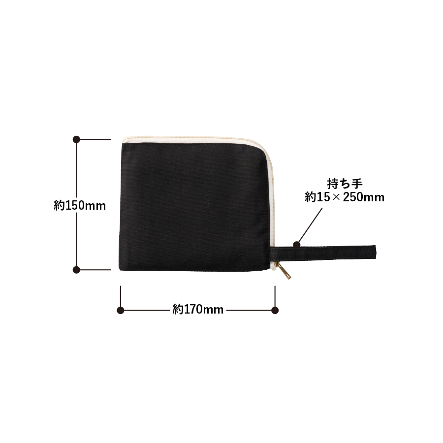 ファスナーはL字に開くため物の出し入れがしやすく、ストラップ付なので持ち運びにも便利です。