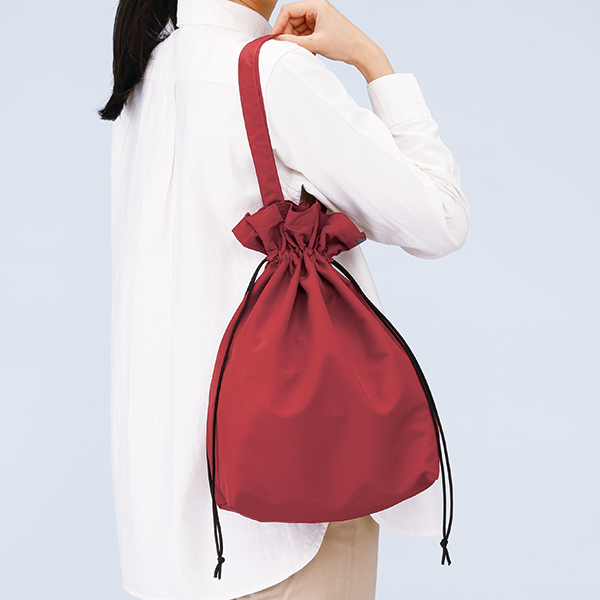 上質な質感でワンランク上の再生PETを使用したエコバッグです。 さらりとした質感でシワになりにくい特徴のソフト再生PET生地は、リサイクル素材にも関わらず高級感があります。口元を開けたまま、あるいは絞っての2WAYで、使用場面に合わせて使うことができます。