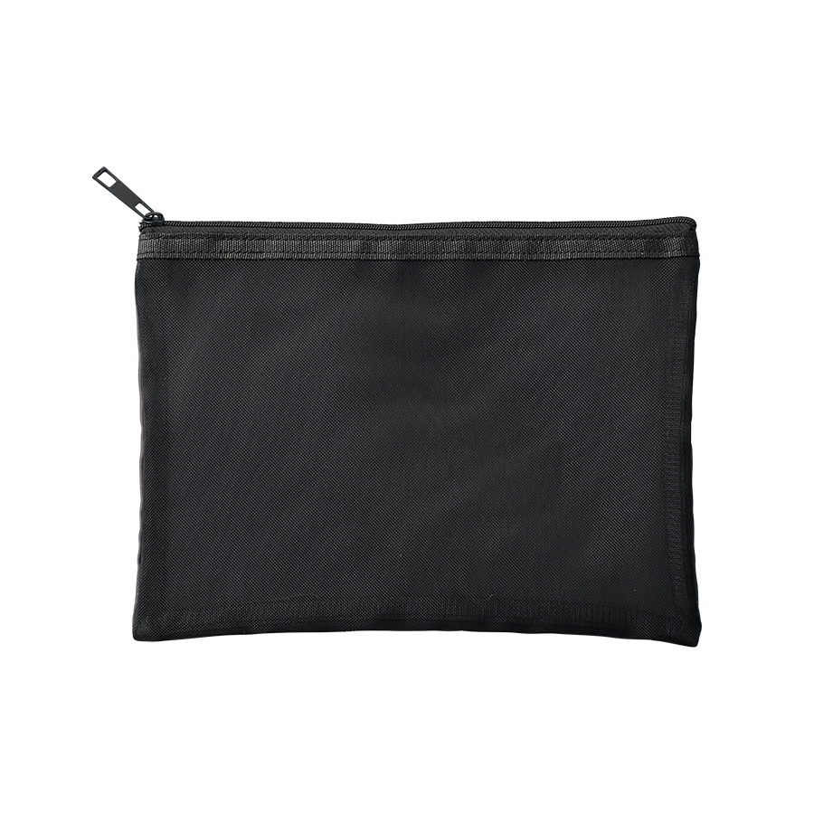 フラットタイプですっきりと使える、片面がメッシュになったポリエステルポーチです。
