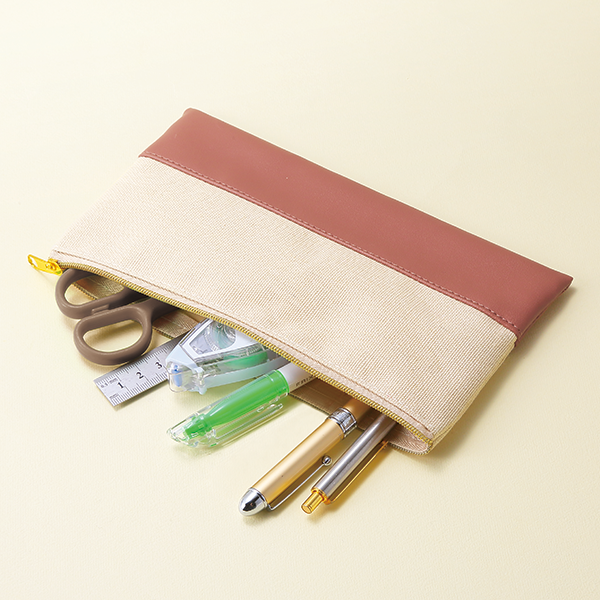 コスメやステーショナリーアイテムや通帳などマルチに役立つワイドなサイズ感が便利な、マチなしフラットでスリムに使えるポーチです。 くすみカラーの合皮×ナチュラル生地の、色と素材で遊ぶ大人かわいいデザインです。アイデア次第で様々な使い方ができる多機能性やおしゃれな見た目など、定番販促品こそこだわりが見える一品が◎。美容、インテリアなど各種イベントにおすすめです。