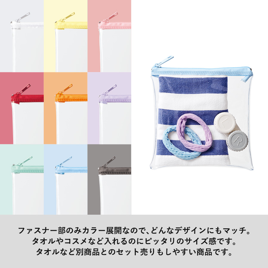 カラーファスナーがポイントの正方形クリアポーチです。ファスナー部分のみカラー展開なので、シンプルな印象でどんなデザインにもマッチするアイテムです。