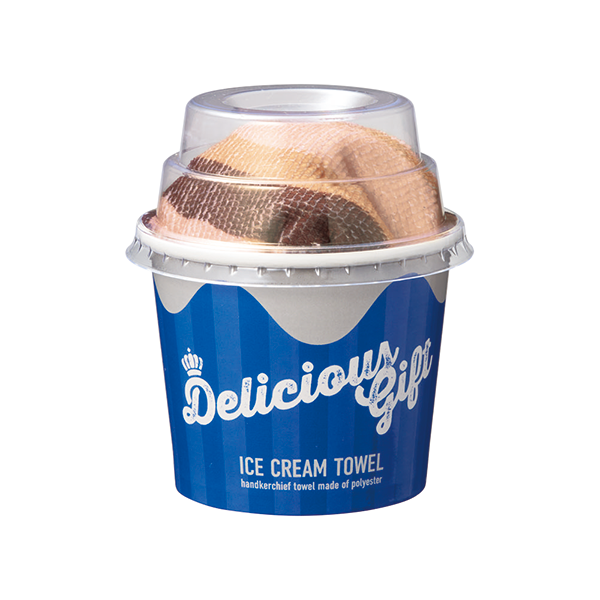 カップアイス風のおしゃれなパッケージ入り。並べてディスプレイしても映える商品です。 タオルは大きめサイズでプチギフトに便利。