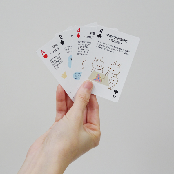 避難所での娯楽としてはもちろん、普段の遊びの中で防災を学べます。防災に役立つ情報が書かれたトランプです。