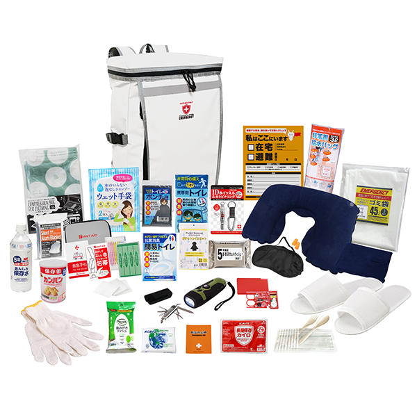 | 付属品 | 収納リュック・防災の心得・IDホイッスル&カラビナリング・カイロ・レインコート・携帯用トイレ・抗菌消臭簡易トイレ・トイレポンチョ・ダイナモマルチライト・モバイルバッテリー(乾電池式)・軍手・静音アルミブランケット・ウェットティッシュ・衣類圧縮袋・スリッパ・ネックピロー・アイマスク・耳栓・5年保存水500ml・カンパン・カトラリーセット・8徳ナイフ・給水袋3L・ソーイングセット・緊急避難カード・水に流せるペーパー・救急6点セット・ウェット手袋・45Lゴミ袋3P・歯磨きティッシュ |