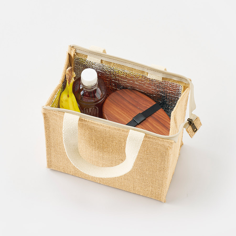 ジュート素材の保冷スクエアトートバッグです。普段使いのランチバッグからレジャー・アウトドアまで幅広く扱えます。