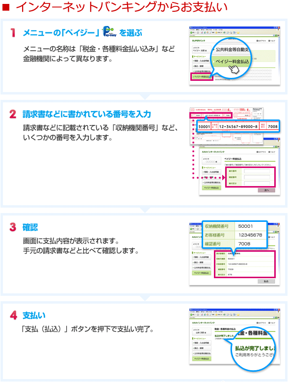 Pay-easy対応の金融機関ATM、およびインターネットバンキングでお支払いができます。